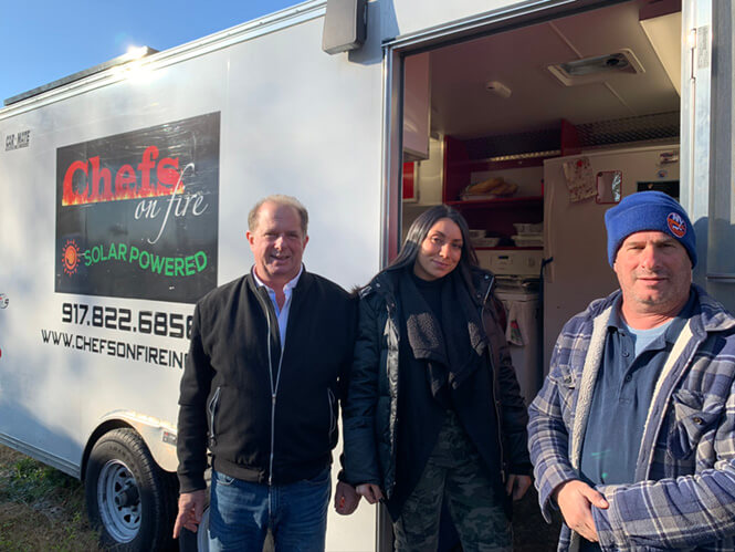 Green Idle Founders Robert Drucker and Neil Robbins with Solar-Powered Chef’s on Fire Operator on the set of Apple TV’s “Dickenson” at Old Bethpage Restoration Village